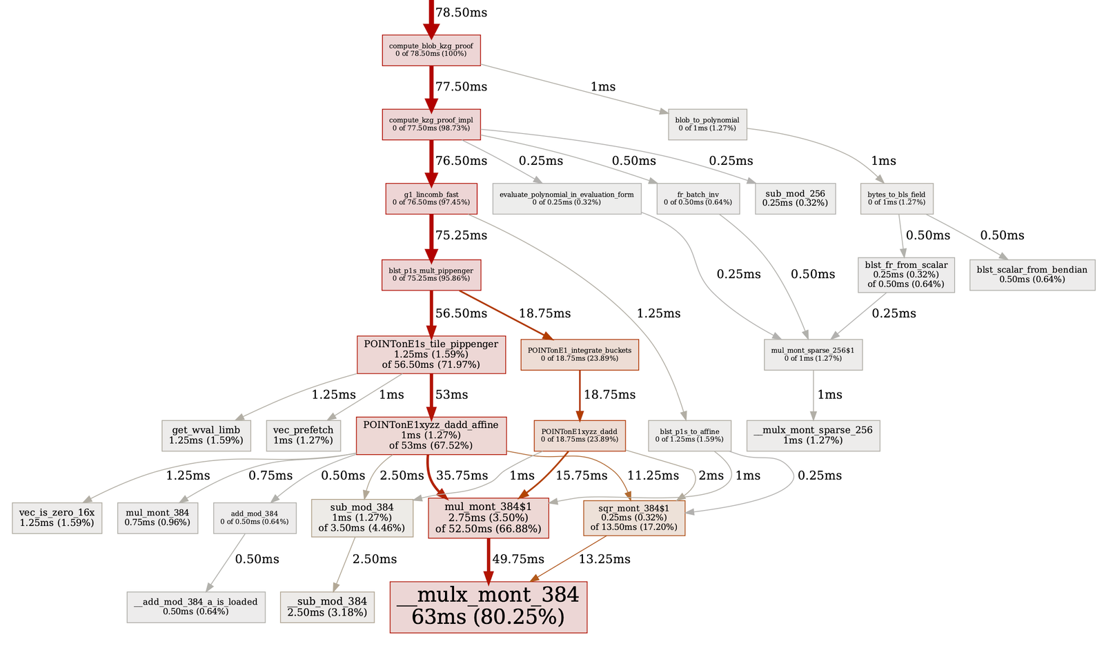 Here’s a bigger example from one of c-kzg-4844’s functions. The following image is the profiling graph for compute_blob_kzg_proof. As you can see, 80% of this function’s time is spent performing Montgomery multiplications. This is expected.