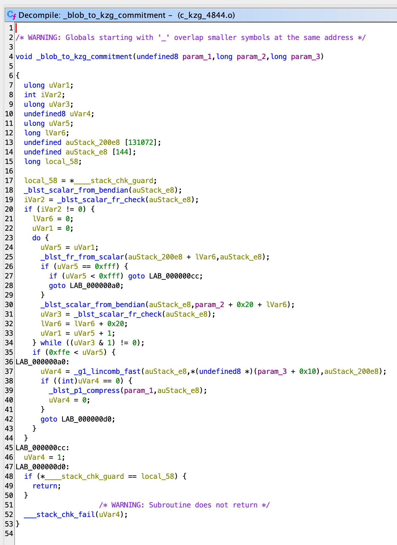 For example, this is what blob_to_kzg_commitment initially looks like in Ghidra: