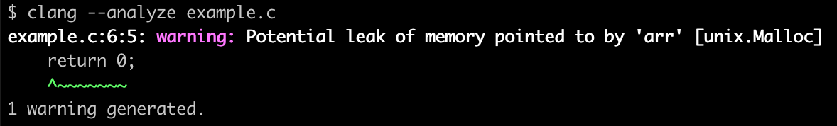 The unix.Malloc checker will identify that arr wasn’t freed. The line in the warning message is a bit misleading, but it makes sense if you think about it; the analyzer reached the return statement and noticed that the memory hadn’t been freed.
