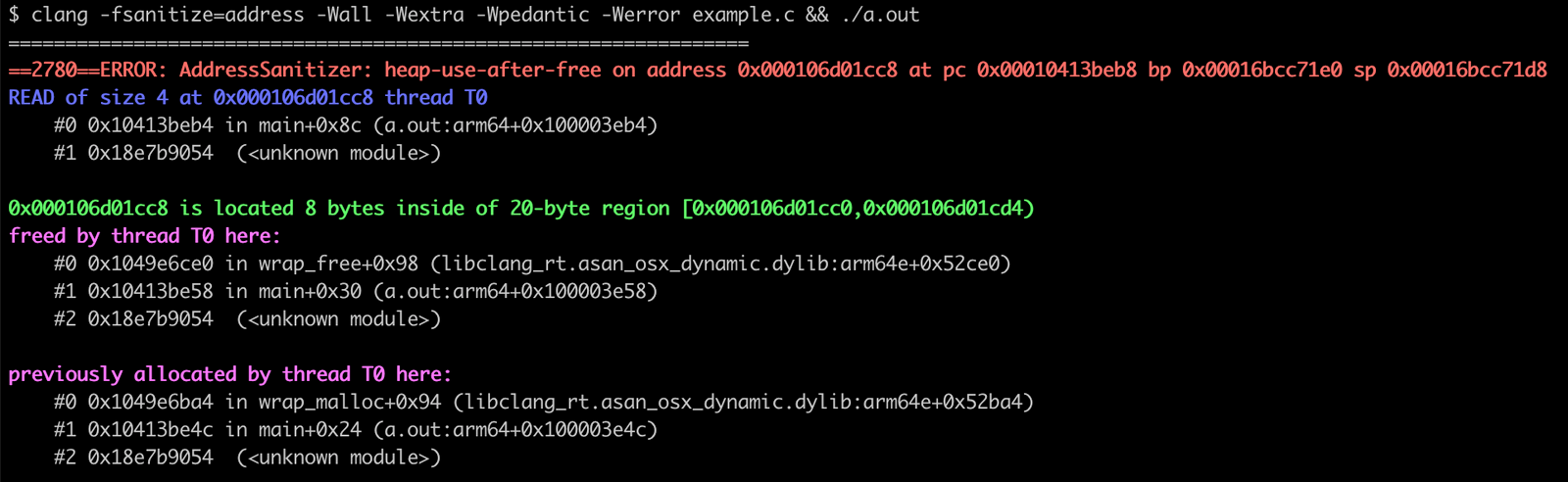 It tells you that there’s a 4-byte read of freed memory at main+0x8c.