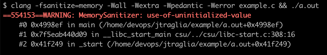 When compiled with -fsanitize=memory and executed, it will output the following error message:
