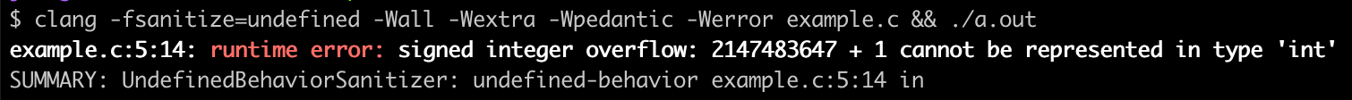 UndefinedBehaviorSanitizer (UBSan) detects undefined behavior, which refers to the situation where a program’s behavior is unpredictable and not specified by the langauge standard. Some common examples of this are accessing out-of-bounds memory, dereferencing an invalid pointer, reading uninitialized variables, and overflow of a signed integer. For example, here we increment INT_MAX which is undefined behavior.