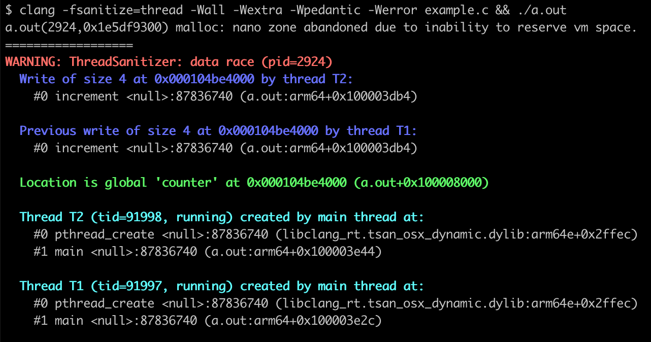 ThreadSanitizer (TSan) detects data races, which can occur in multi-threaded programs when two or more threads access a shared memory location at the same time. This situation introduces unpredictability and can lead to undefined behavior. Here’s an example in which two threads increment a global counter variable. There aren’t any locks or semaphores, so it’s entirely possible that these two threads will increment the variable at the same time.
