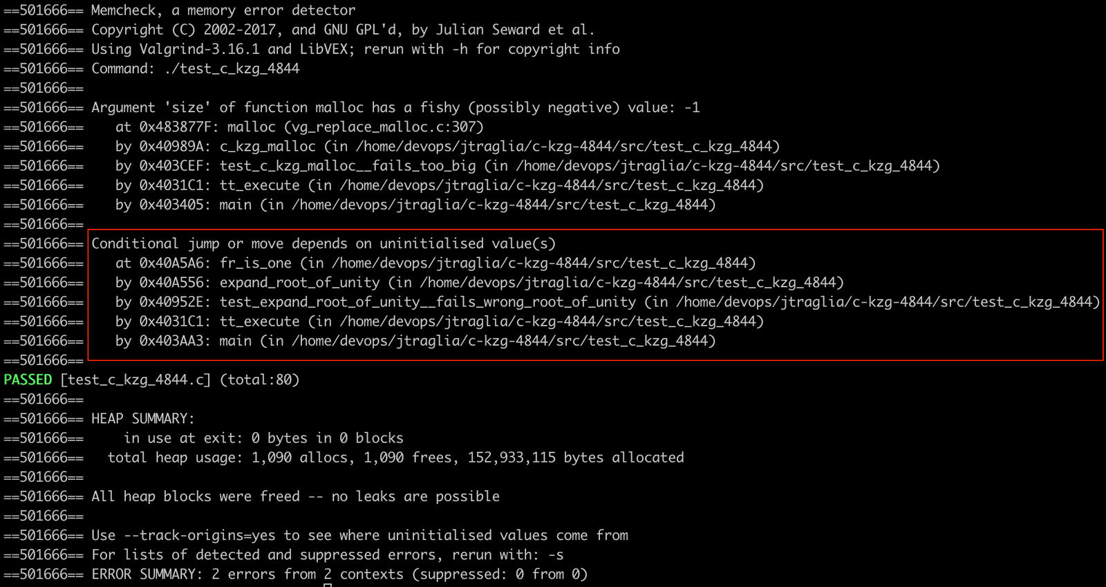 The following image shows the output from running c-kzg-4844’s tests with Valgrind. In the red box is a valid finding for a “conditional jump or move [that] depends on uninitialized value(s).”
