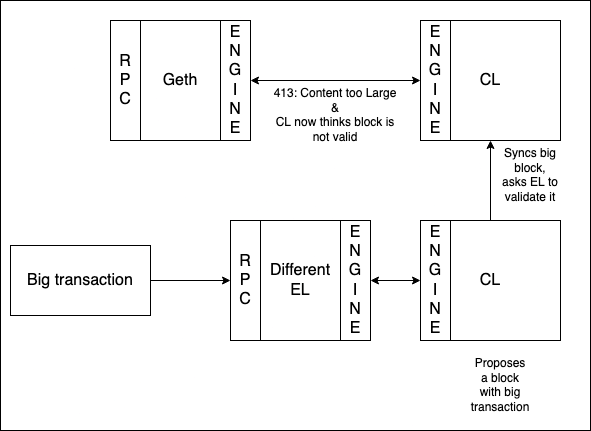 Prior to the merge, different message size limits for RPC communication were set to protect clients from denial-of-service (DOS) attacks. These limits, applied to messages received via HTTP endpoints, were carried over to the engine API, which plays a crucial role in connecting Execution and Consensus Layer clients during block production. Due to the engine API’s involvement in block production, it became possible for blocks to be produced that surpassed the RPC size limits of some clients but remained within the acceptable range for others.