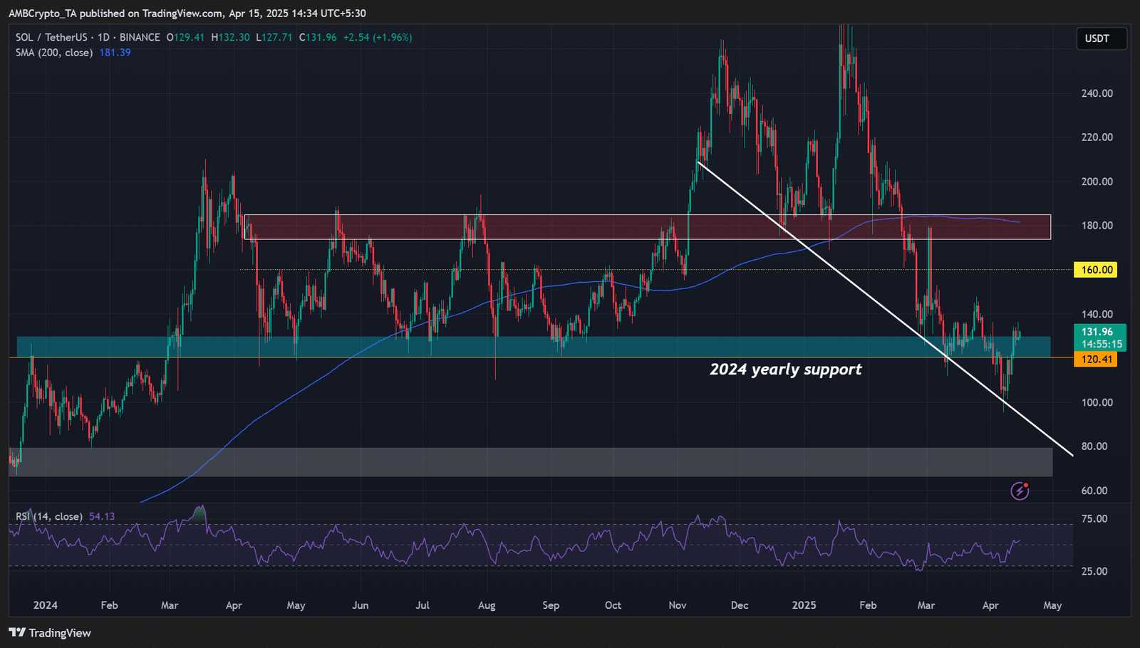 Despite the lukewarm demand, SOL’s price was back above its 2024 yearly support of $120. Should the support hold, the altcoin could eye $140 or $160 levels.