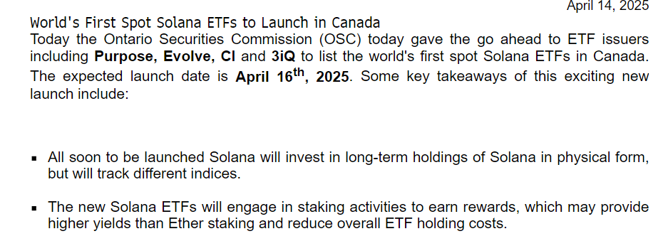 “Canada is readying spot Solana ETFs to launch this week after regulator gave green light to multiple issuers incl Purpose, Evolve, CI, and 3iQ. ETFs will include staking via TD.”