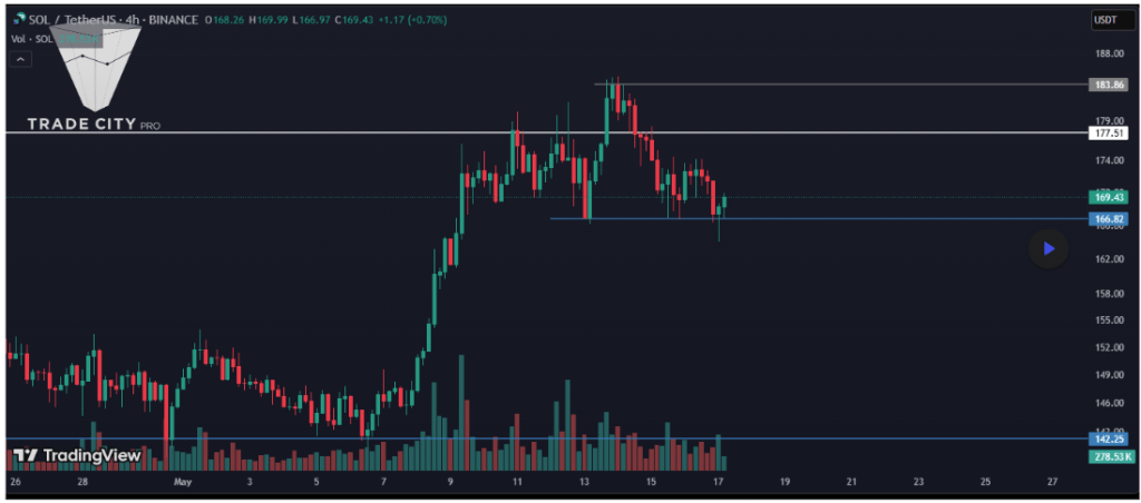 Solana (SOL) has struggled to maintain momentum after a rally that saw it peak around the $183 level on May 14. Since then, Solana’s price action on the 4-hour chart hasn’t given a clear direction, with the cryptocurrency pulling back to retest a key support zone near $166.