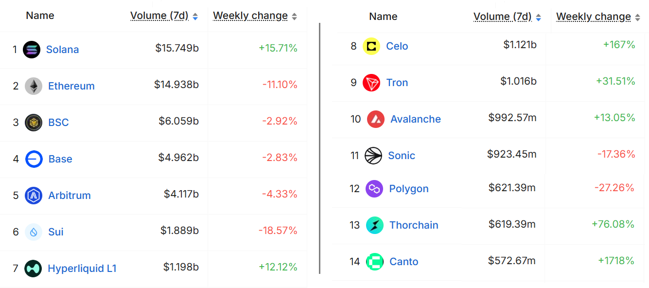 Blockchains ranked by 7-day DEX volumes, USD. Source: DefiLlama