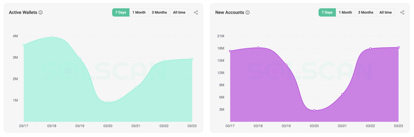 One big factor in Solana’s price is how many people are using the network. Over the past week, the number of active wallets dropped to 1 million on 20 March, before jumping back up to 3 million by 23 March.
