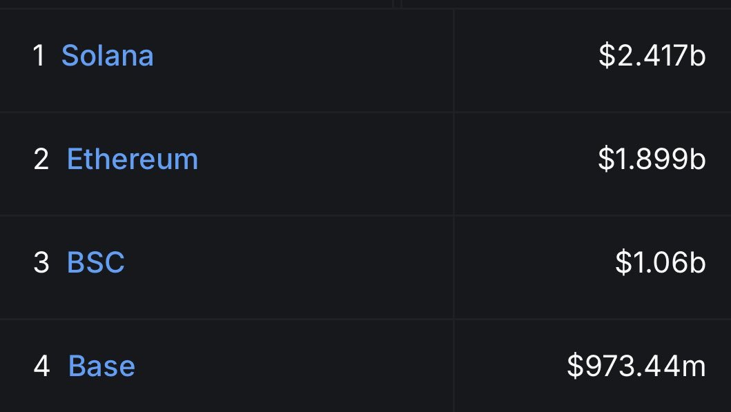 Worth pointing out, however, that Solana saw bullishness in other metrics. Its figures of $2.417 billion in daily DEX volume surpassed the volumes of Ethereum at $1.899 billion, BSC at $1.066 billion, and Base at $973.44M.