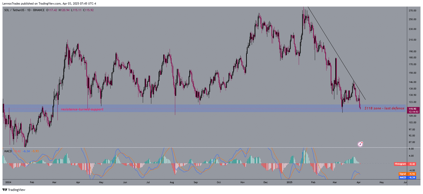 Previous attempts to stabilize SOL’s price around $110 and $100 could come into play now though. Especially since traders have failed to reclaim the $118 support after Trump’s ‘Liberation Day’ tariffs.