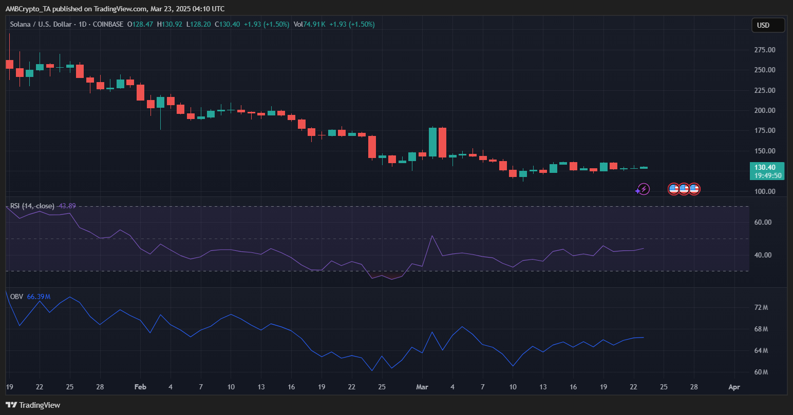 Solana was trading at $130.40, showing minor gains of 1.5% on the day, but the broader trend remained weak. The RSI was 43.89 — below the neutral 50 mark — indicating fading bullish momentum.