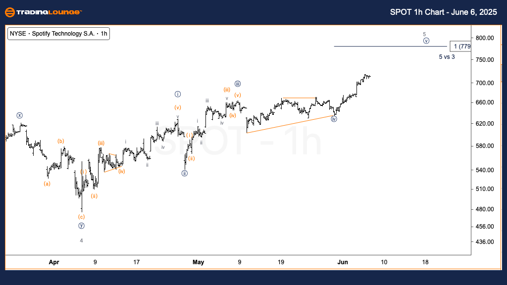 In the hourly timeframe, SPOT is moving within wave {v} of 5. With wave {iii} being shorter than wave {i}, upside is expected to cap at approximately $779, aligning with typical Elliott Wave guidelines. This count suggests a near-term high may soon form, followed by a likely corrective phase.