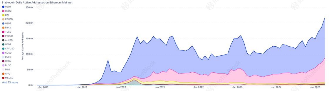 Stablecoin daily active addresses on Ethereum mainnet. Source: IntoTheBlock