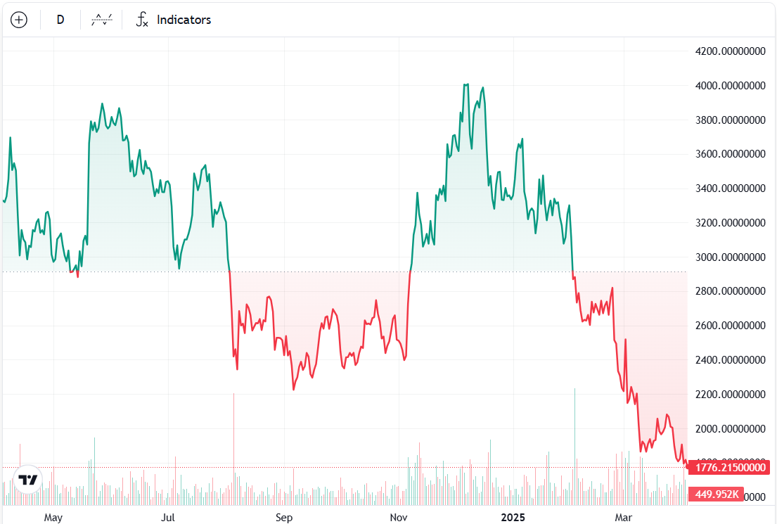 The decline in ETH is linked to a combination of broader macroeconomic concerns and Ethereum-specific pressures, such as increased competition from networks like Solana and the rise of layer-2 protocols.