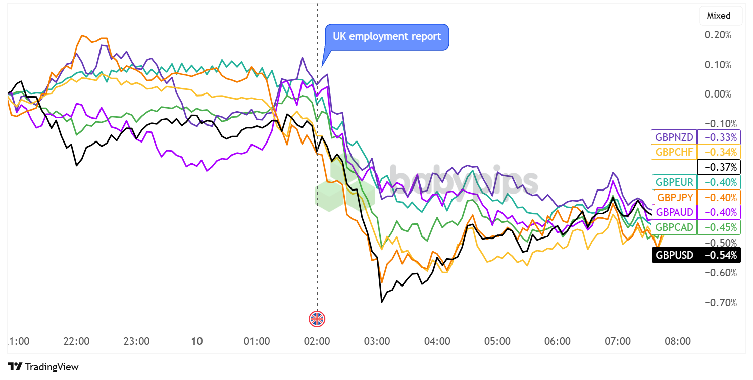 The pound experienced significant weakness following the employment data release, with sterling declining against all major trading partners.
