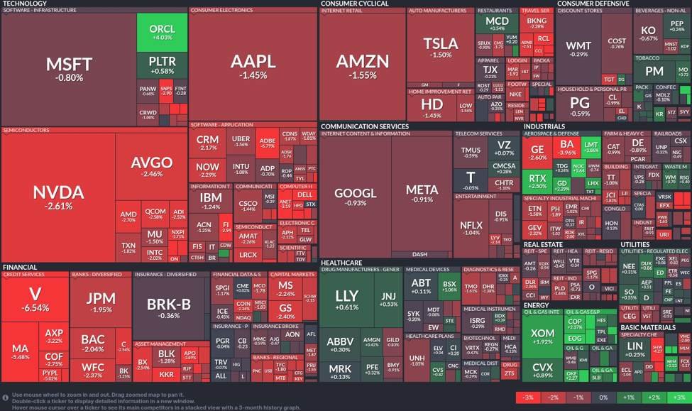 💼 Financial Struggles: For financials, companies like Visa (V) and JPMorgan Chase (JPM) are witnessing drops of 6.54% and 1.95% respectively, indicating potential worries in consumer spending or credit risks.