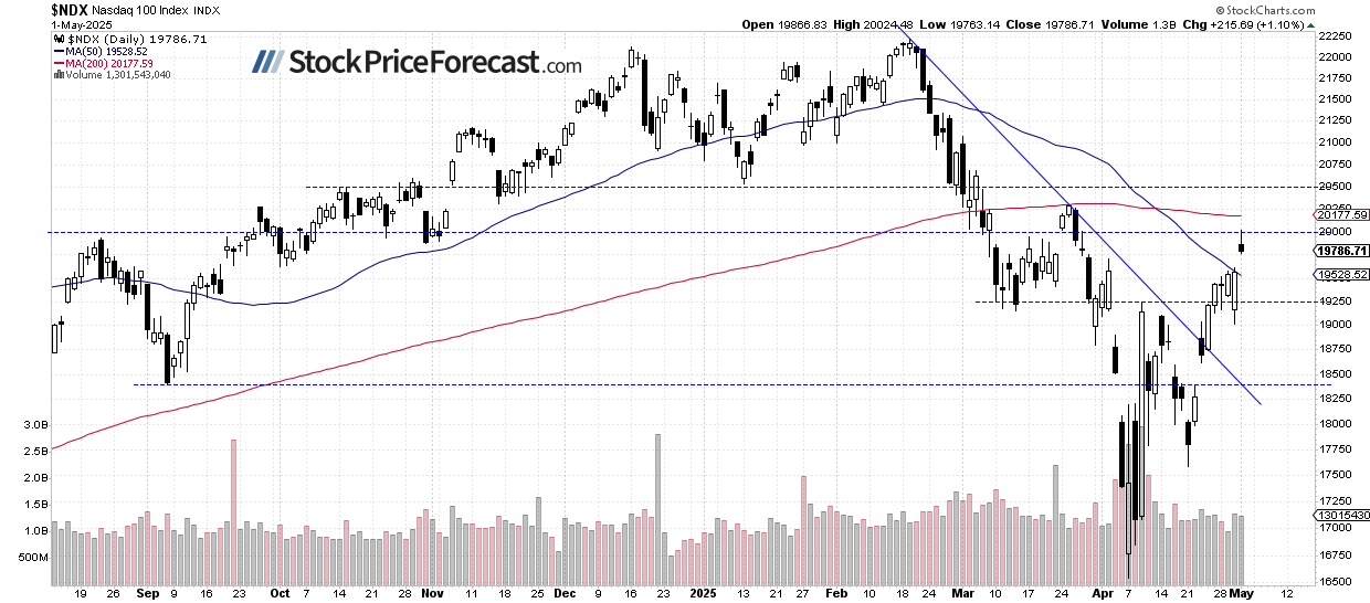 The S&P 500 gained 0.63% on Thursday, extending its uptrend after Microsoft and Meta impressive earnings released on Wednesday. The market advanced despite weak economic data suggesting recession concerns following recent trade policy shifts.