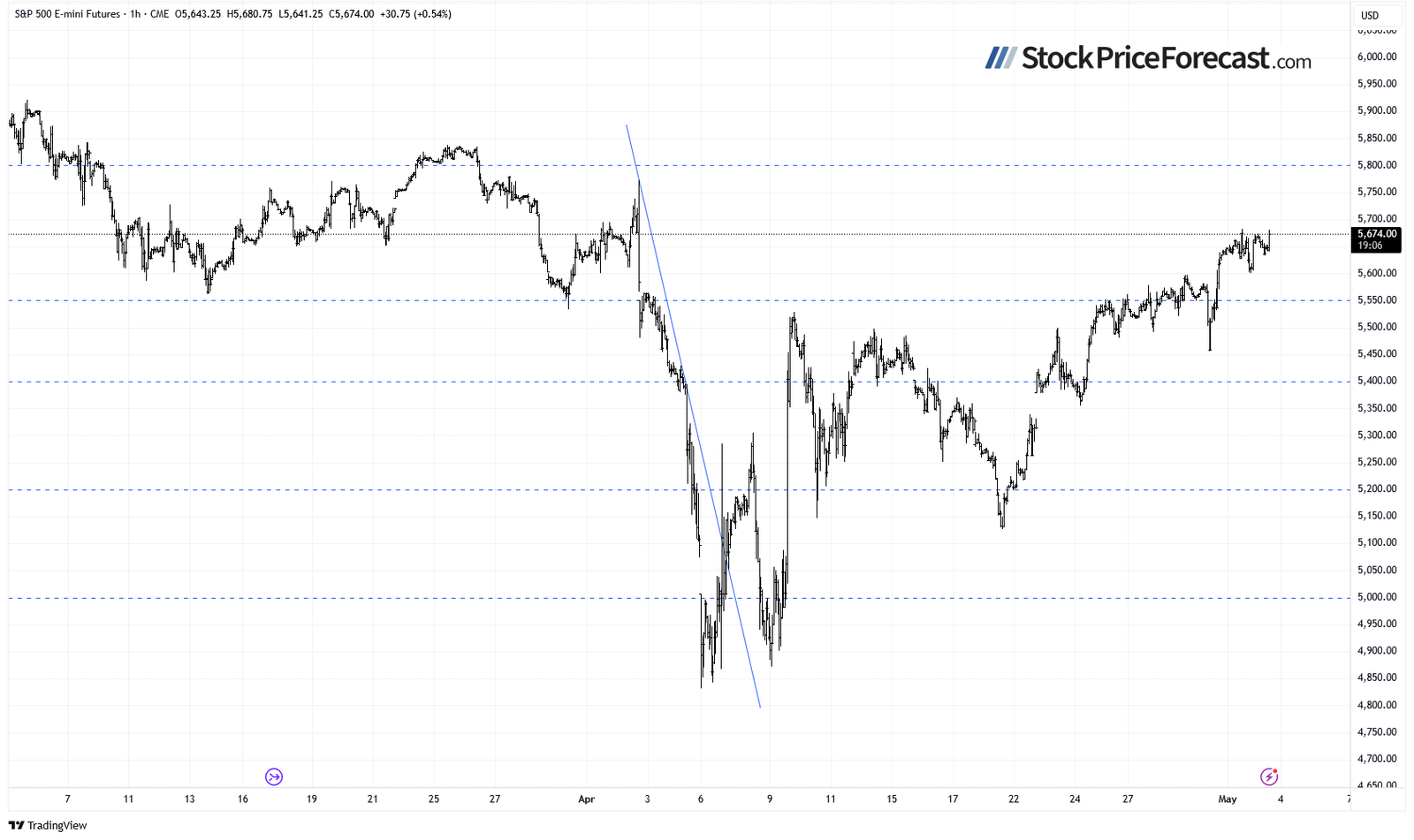 This morning, the S&P 500 futures contract is trading along its local highs, retracing its overnight weakness and gaining 0.7%. Resistance level is around the 5,700 mark, while support remains at 5,600.