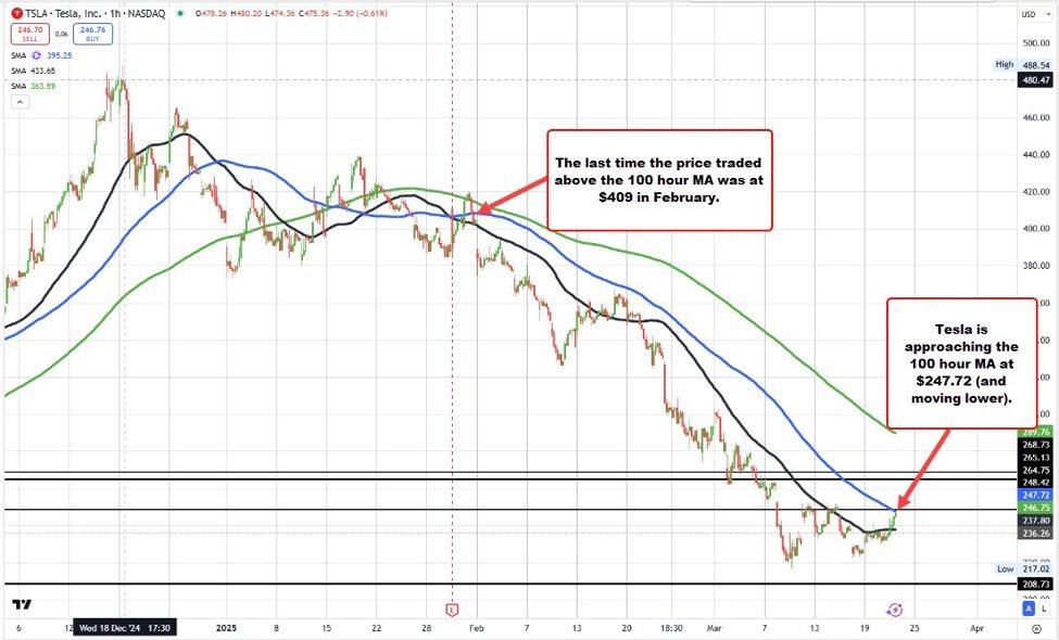 Pres. Trump’s comment that a lot of companies have been talking to him about exemptions suggests there is some wiggle room. Within his staff, Elon Musk of Tesla would likely be one of those who might get special treatment. They have a big presence in China. Shares of Tesla are up $9.40 or 3.97% $245.65. It’s 100-hour moving averages at $247.71 and moving lower. Get above that moving average would be a bullish technical development. The last time the price traded above the 100 hour moving average was back on January 31 when the price was at $409.