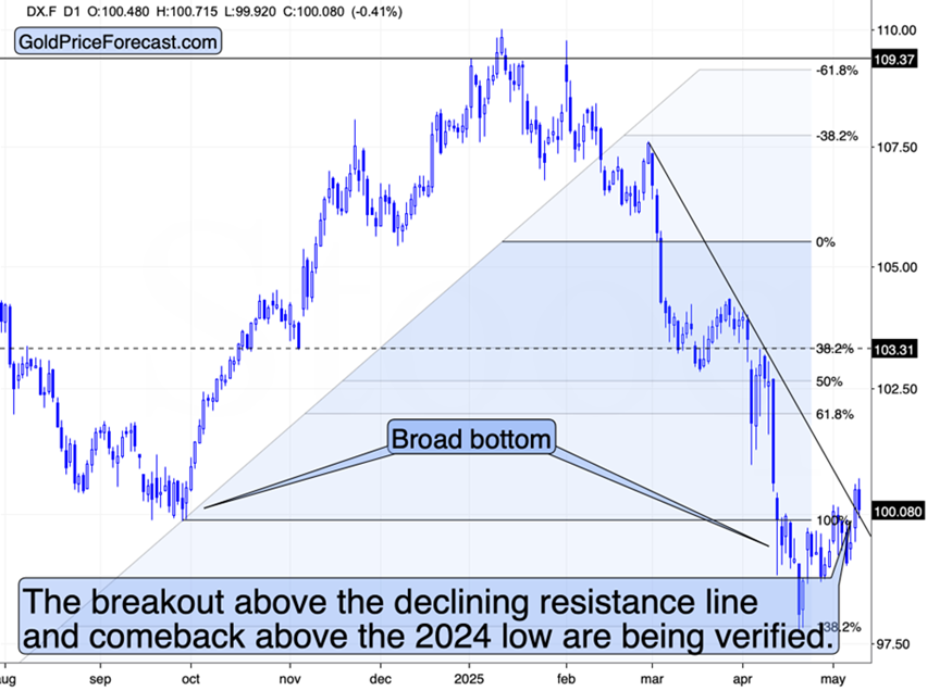 The verification of the breakout above the short-term resistance line as well as the invalidation of the move below the 2024 low confirms the very bullish outlook. This is particularly the case, since so many investors out there are still bearish on the U.S. currency. (reverse Asian financial crisis, anyone?)