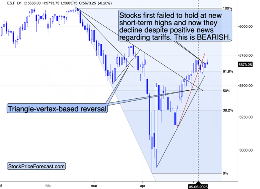 From a technical analysis perspective, today’s price action further confirms what the charts have been telling us: the market is likely positioned for a meaningful decline regardless of news flow. When markets fail to rally on positive news, it’s often a sign that selling pressure remains dominant. In other words, even though stocks’ move lower was small, the message is loud: stocks want to decline here.