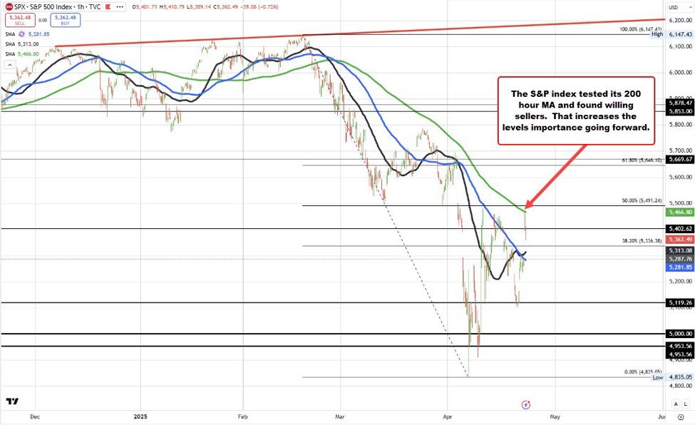 At session highs today, both the S&P and NASDAQ indices tested their falling 200 hour moving averages. For the S&P index, the 200 hour moving average comes in at 5467. The high price was 5469 (green line on the chart below).