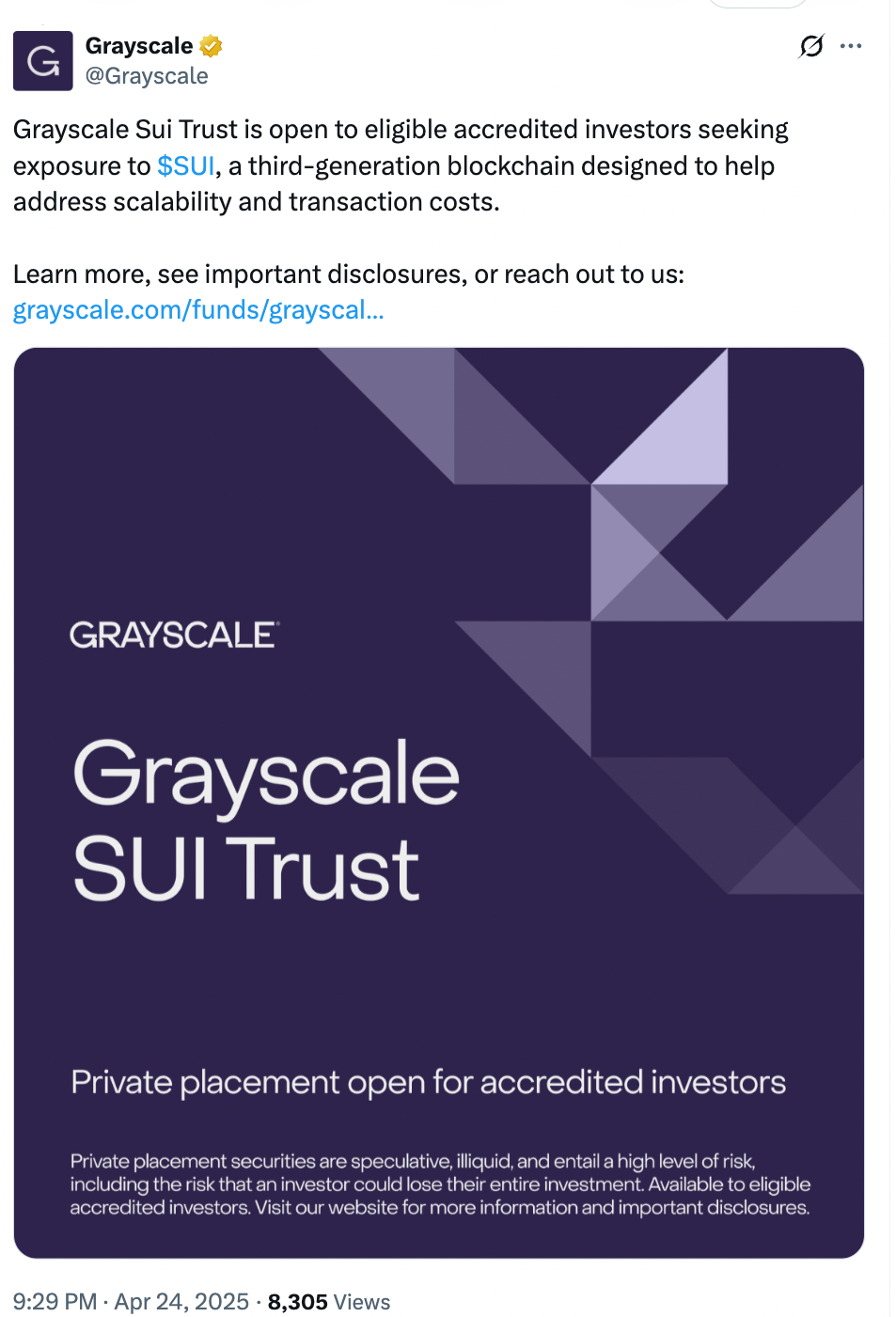 On April 23, Grayscale launched the Grayscale SUI Trust, which enables investors to gain exposure to SUI. The trust is now open to all eligible accredited investors.