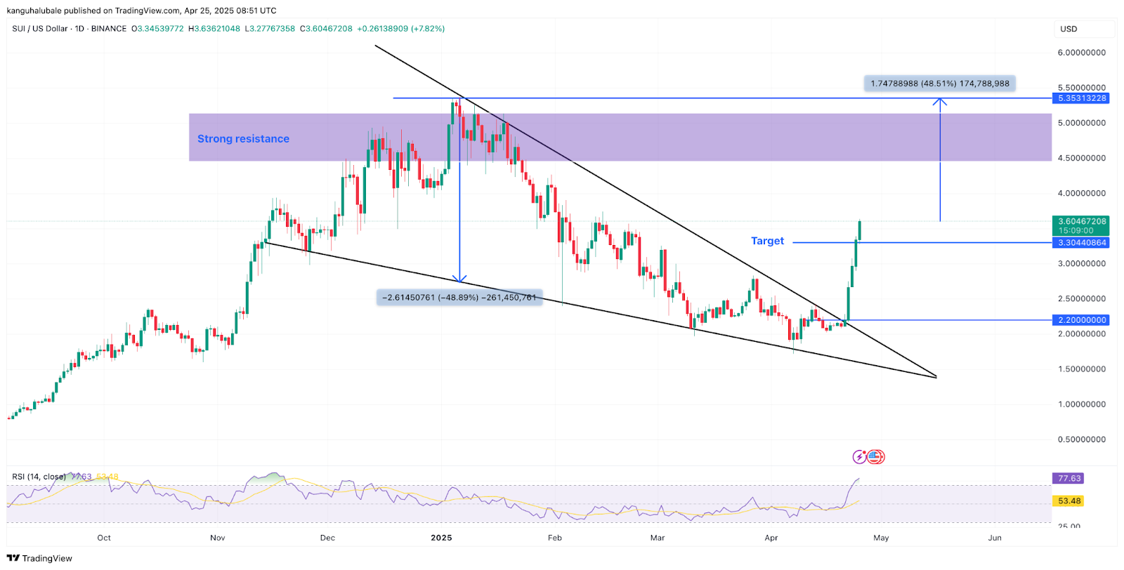 Data from Cointelegraph Markets Pro and TradingView shows SUI rose from a low of $2.11 on April 21, climbing as much as 77% to an intraday high of $3.71 on April 25.