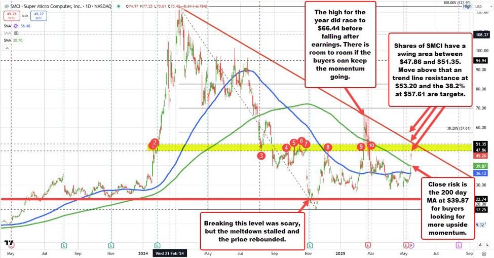 For SMCI, the rebound comes after a volatile stretch. Shares had surged to a post-split high of $122.90 in 2024 (following a 10:1 split in October), only to plunge to $17.25 in November amid concerns over accounting irregularities and a delayed earnings release that nearly cost the company its NASDAQ listing. Though the most recent earnings report on May 6 fell short—EPS of $0.31 vs. $0.41 expected, and revenue of $4.6 billion vs. $5.01 billion—the new partnership, coupled with renewed AI enthusiasm and improved transparency, has sparked a sharp reversal in sentiment.