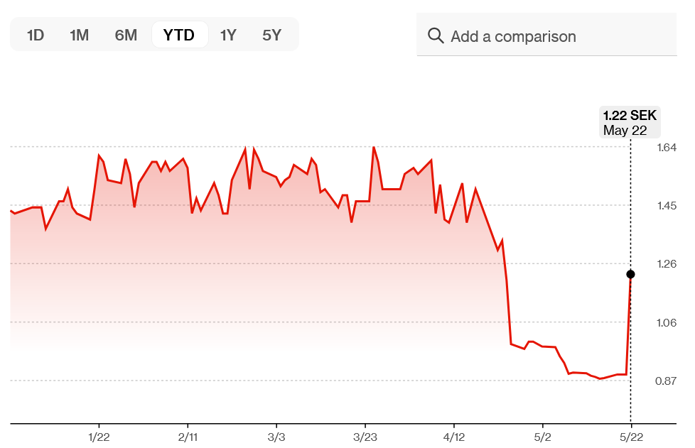 The company’s shares closed May 22 trading up 37% to 1.22 Swedish krona ($0.13) on the Nordic Growth Market following its disclosure of its Bitcoin purchase, Bloomberg data shows.