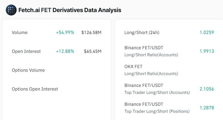 Looking at FET, the altcoin has experienced a 12.88% increase in its Open Interest, hitting $65.4 million, while volume shot up by 54.9%, reaching $126.5 million.