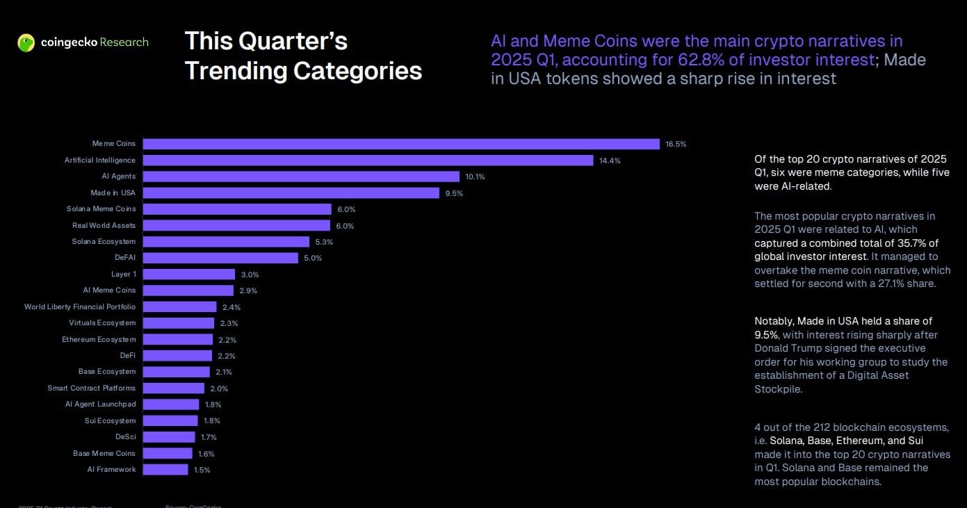 Equally, AI-related tokens (artificial intelligence, AI agents, and AI frameworks) accounted for 25% of the Q1 narrative.