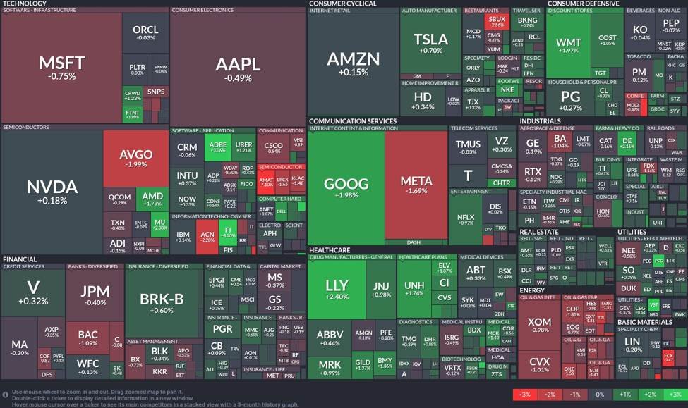 - 📉 Semiconductors: The sector showed mixed signals with Nvidia (NVDA) inching up by 0.18% while Broadcom (AVGO) dropped by 1.99%. Concerns remain prevalent about overvaluations and potential supply chain disruptions.