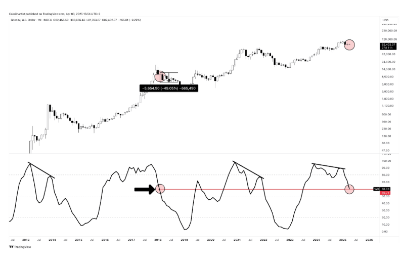 However, he argues that this level has little in common with the 2017 bull run’s momentum peak and aligns more closely with the beginning of the 2018 bear market. During that point in the cycle, Bitcoin suffered a staggering 49% drop within a single month, from wick high to wick low.