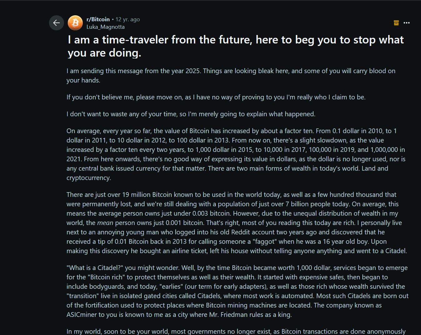In 2013, a now-legendary Reddit post titled “I am a time-traveler from the future, here to beg you to stop what you are doing” appeared online. The author – claiming to be from 2025 – warned of a future shaped by Bitcoin, but not in the way many had hoped. It wasn’t a utopia. It was a stratified society where those who adopted early became untouchably rich, and everyone else was left behind. Whether satire, fiction, or genuine warning, the post struck a nerve. It spread quickly. It became part of the cultural and memetic architecture of Bitcoin.