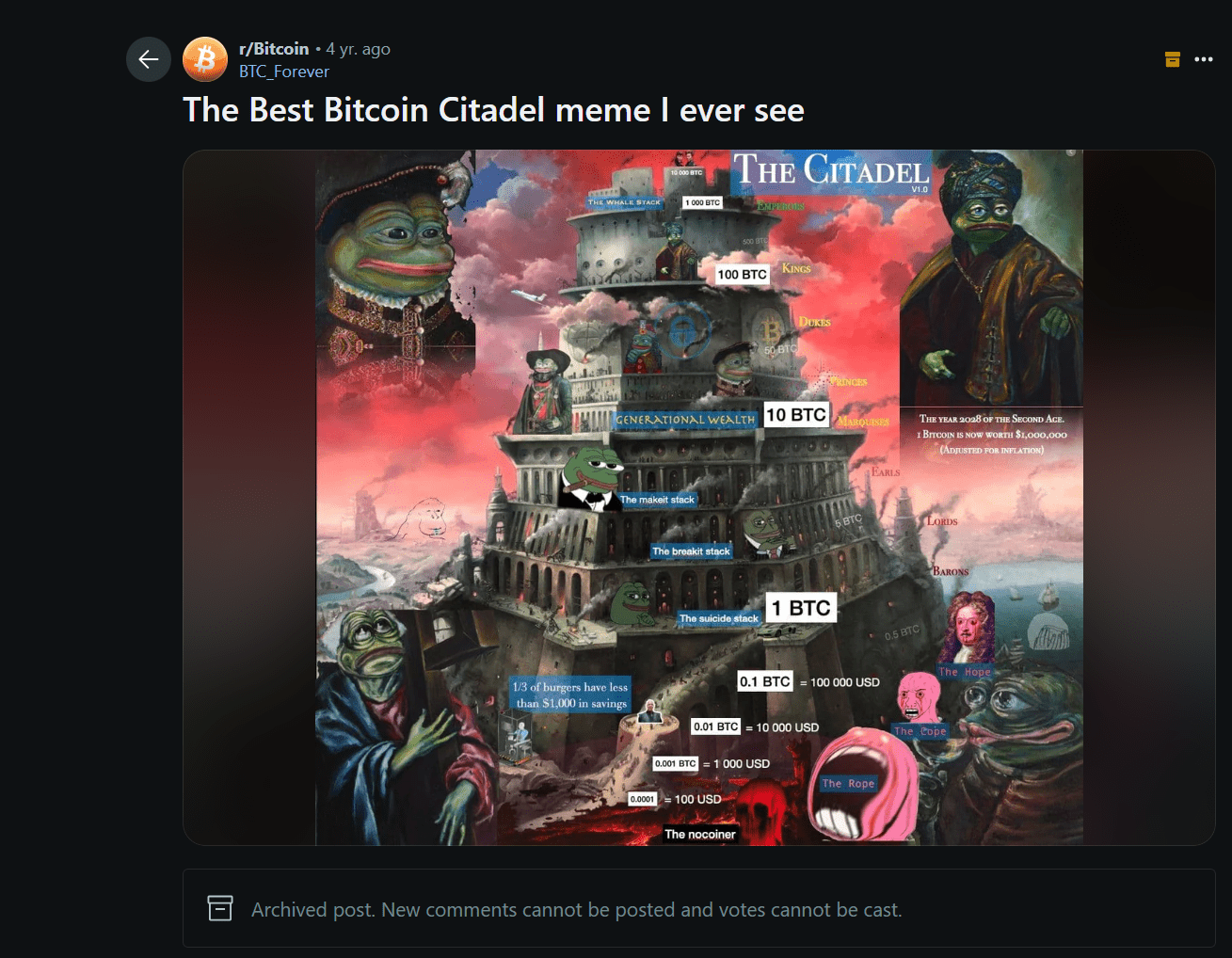 Years later, another anonymous user gave that warning a visual form. The Citadel v.1, likely created on 4chan, featured a massive tower cobbled together from borrowed imagery – most notably a background ripped from Alexander Mikhalchyk’s oil painting Tower of Babel. Red – overlaid with iconic internet figures like Pepe, Wojak, and the Bogdanoff twins. It was chaotic, funny, ominous. And it caught fire. Versions spread across forums. Variants emerged for Monero, Ethereum, and other Bitcoin-based class hierarchies. A whole mythology took shape around it.