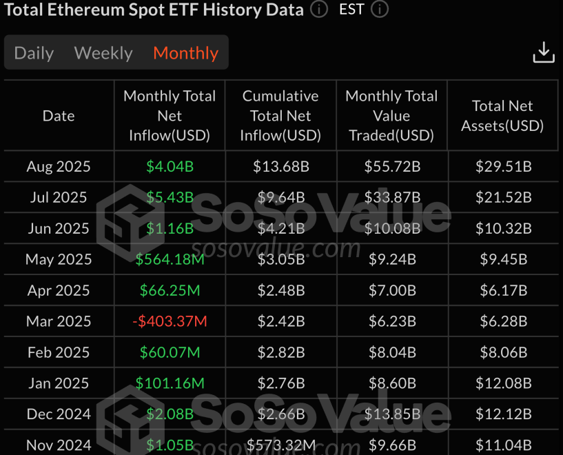 Ethereum (ETH) exchange-traded funds (ETFs) are set to close August 2025 with total net inflows exceeding $4 billion, significantly outpacing their Bitcoin (BTC) counterparts, which recorded more than $600 million in outflows during the same period.