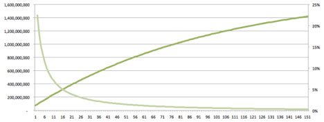 Figure 1. Amount of ETH in existence (dark green curve) on the left axis. Monetary base inflation rate (light green curve) on the right axis. Years on the horizontal axis. (Adapted from Arun Mittal with thanks.)