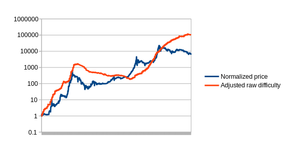 First, let us set up the problem. Formally, we define an estimator to be a function which receives a data feed of some input variable (eg. mining difficulty, transaction cost in currency units, etc) D[1], D[2], D[3]…, and needs to output a stream of estimates of the currency’s price, P[1], P[2], P[3]… The estimator obviously cannot look into the future; P[i] can be dependent on D[1], D[2] … D[i], but not D[i+1]. Now, to start off, let us graph the simplest possible estimator on Bitcoin, which we’ll call the naive estimator: difficulty equals price.