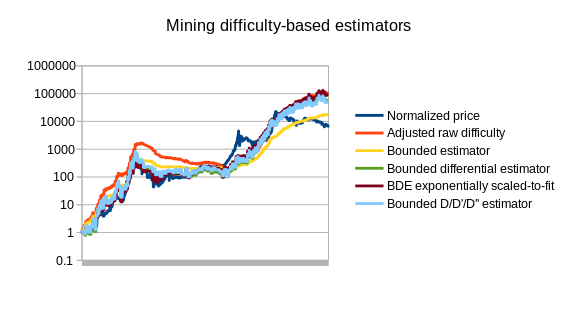 There are more advanced strategies as well; the best strategies should take into account the fact that ASIC farms take time to set up, and also follow a hysteresis effect: it’s often viable to keep an ASIC farm online if you already have it even when under the same conditions it would not be viable to start up a new one. A simple approach is looking at the rate of increase of the difficulty, and not just the difficulty itself, or even using a linear regression analysis to project difficulty 90 days into the future. Here is a chart containing the above estimators, plus a few others, compared to the actual price: