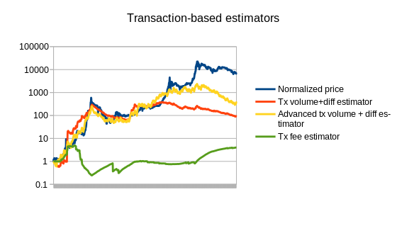 Note that the chart also includes three estimators that use statistics other than Bitcoin mining: a simple and an advanced estimator using transaction volume, and an estimator using the average transaction fee. We can also split up the mining-based estimators from the other estimators: