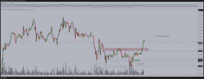 According to Van de Poppe, Bitcoin faces a “crucial resistance” level at around the $96,000 price level and a pullback would offer an accumulation opportunity following the recent “massive breakout.”