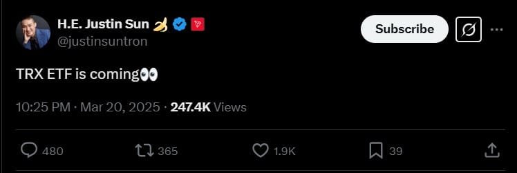 In a recent social media post, TRON founder Justin Sun hinted at a TRON ETF, prompting speculation about whether TRX might soon join the ranks of regulated crypto financial products.