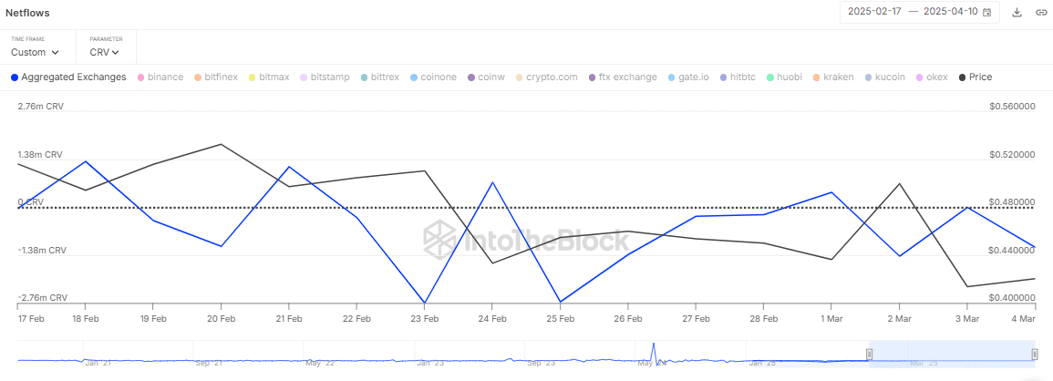 Following the update, traders in the spot market accumulated 1.15 million CRV, worth approximately $667,000, as indicated by the exchange netflows.
