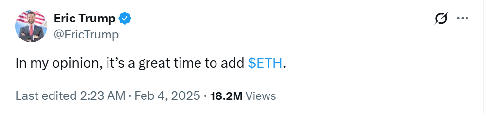 Between Jan. 19 and Jan. 21, it bought nearly 57,000 ETH and continued acquiring it until Feb. 3, when it moved most of the ETH to Coinbase Prime. Coincidentally, Eric Trump was shilling Ether on X at the same time.