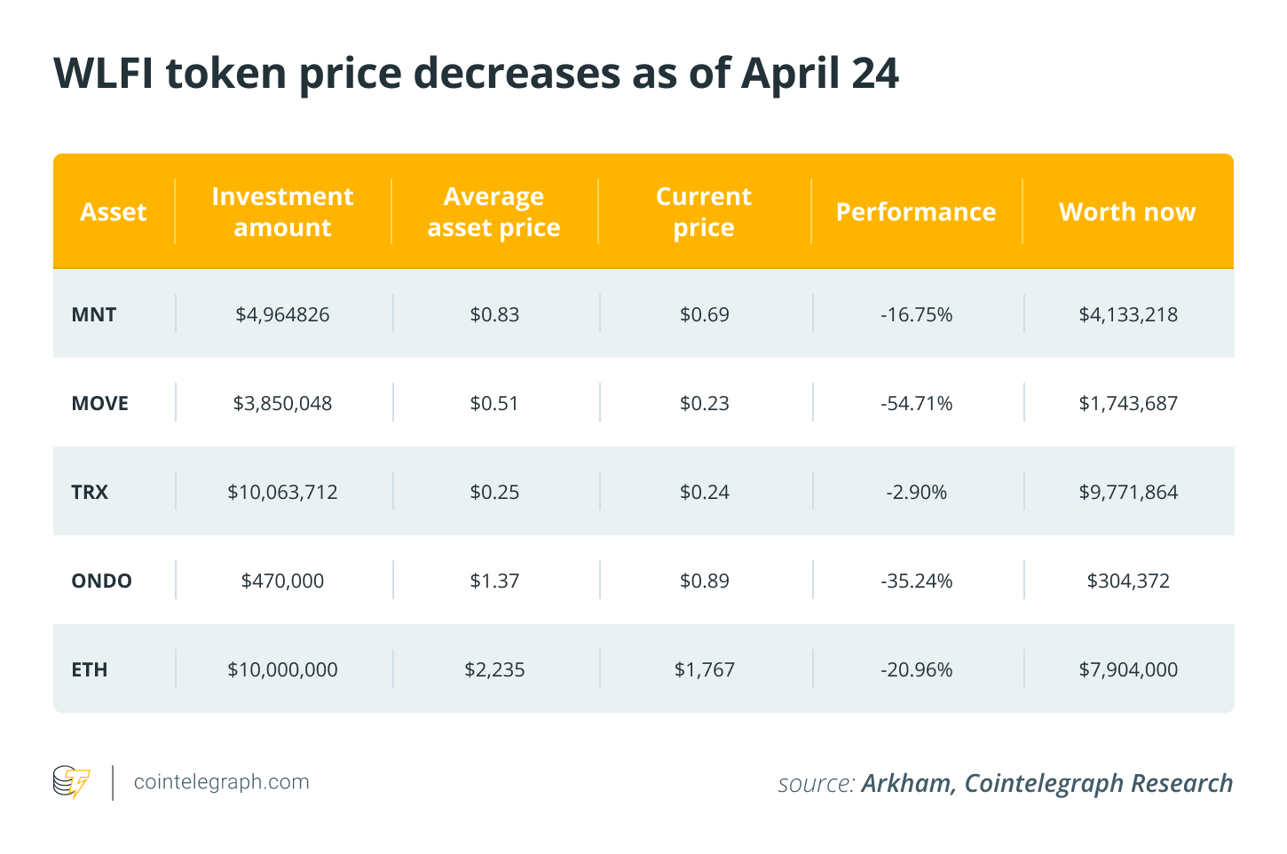 Other positions haven’t been faring nearly as well. Major investments in MNT, MOVE, ONDO and ETH are all seeing losses in the double digits as of April 24. MOVE is taking a beating, with WLFI’s total investment value down over 50%, losing some $2,100,000 on the investment.