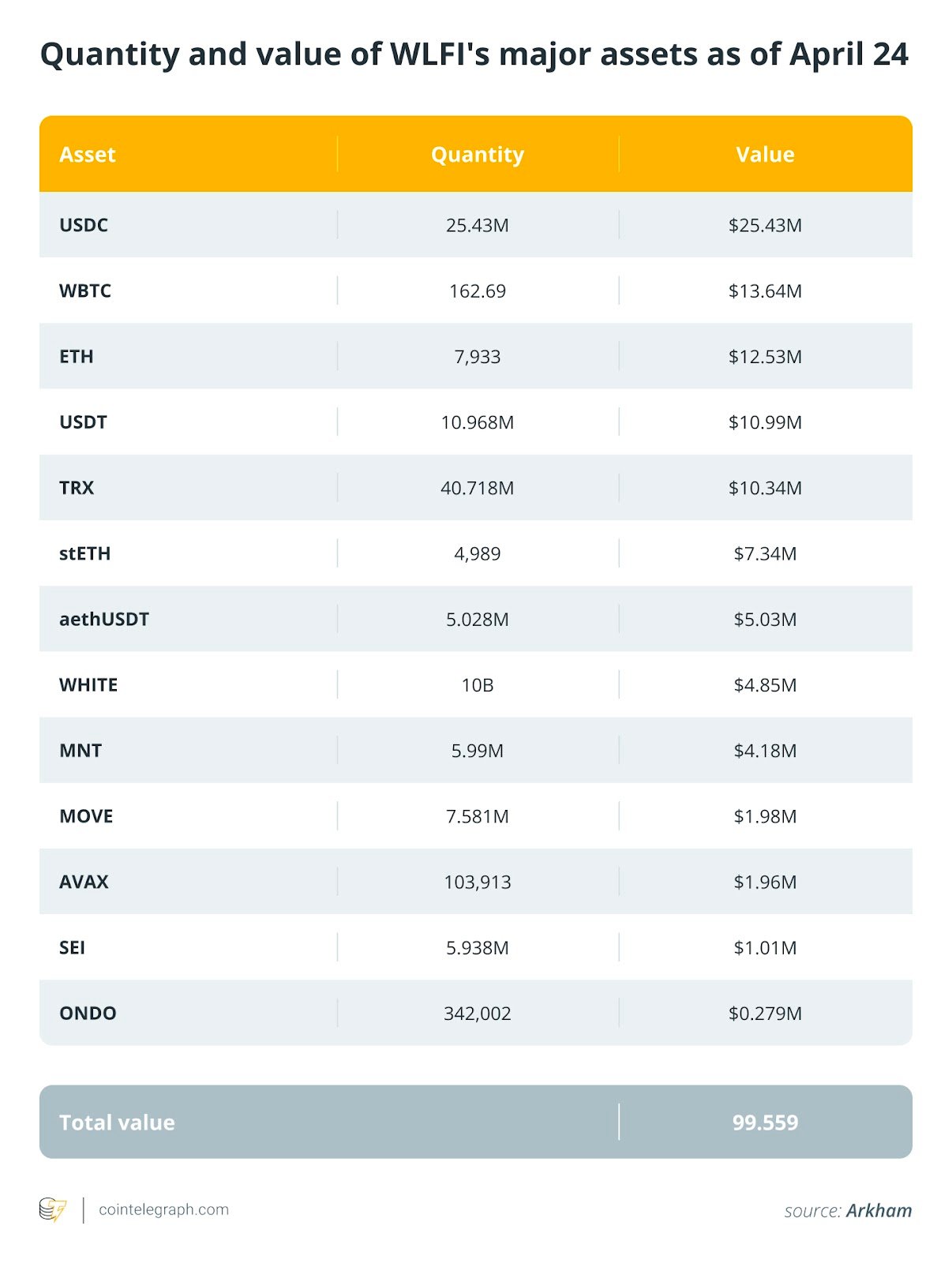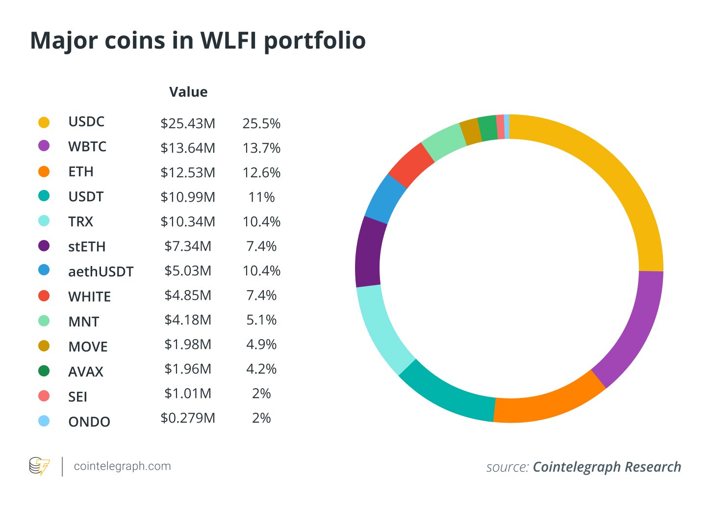 WLFI’s portfolio contains eight cryptocurrencies that are non-stablecoin assets it purchased (versus received via airdrop).