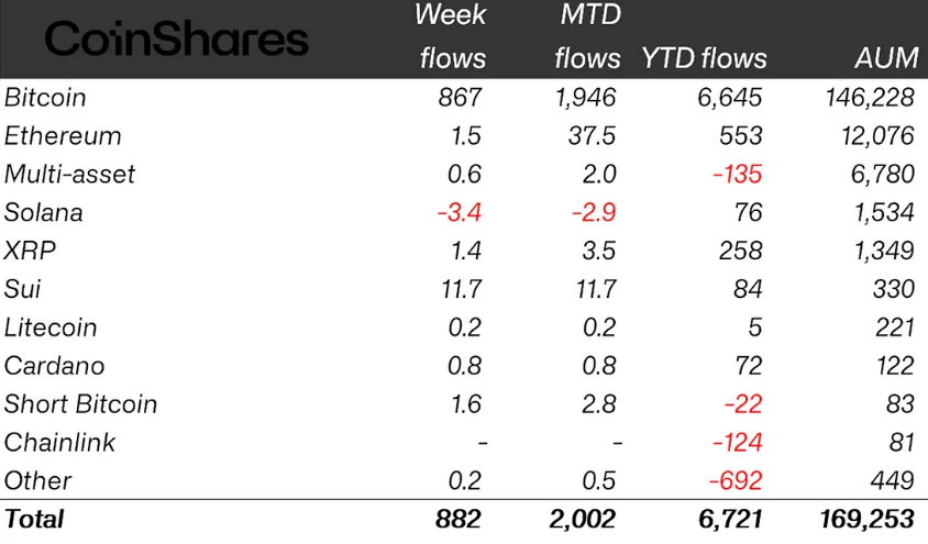 Bitcoin (BTC) dominated with $867 million in inflows in the past week, with YTD inflows reaching $6.6 billion and AUM rising to $146 billion.